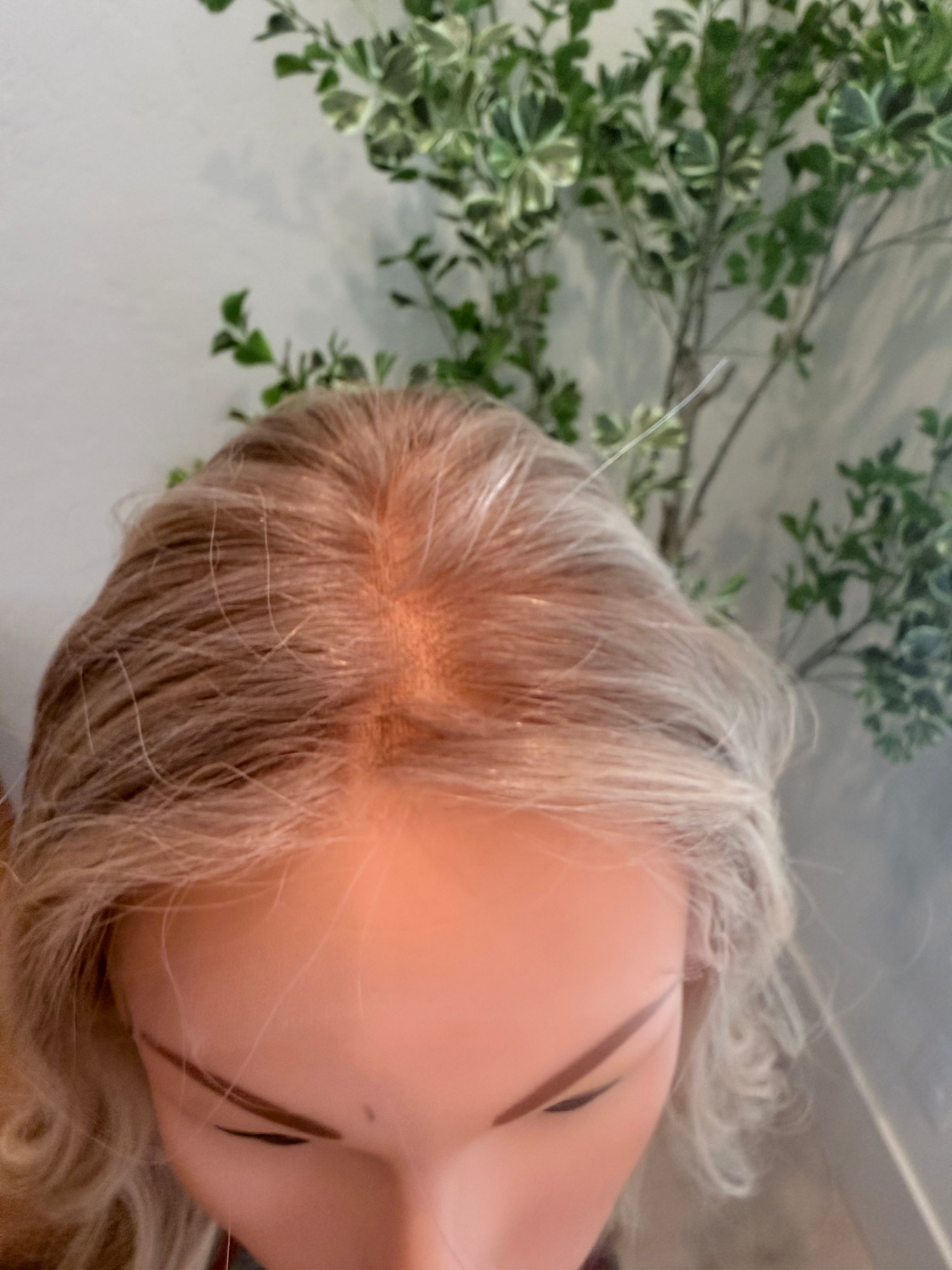 Hair Color: light neatural Blonde rooted with dark blonde for subtle dimension. Dimensional with brown, lighter blindes. Leans neutral.
