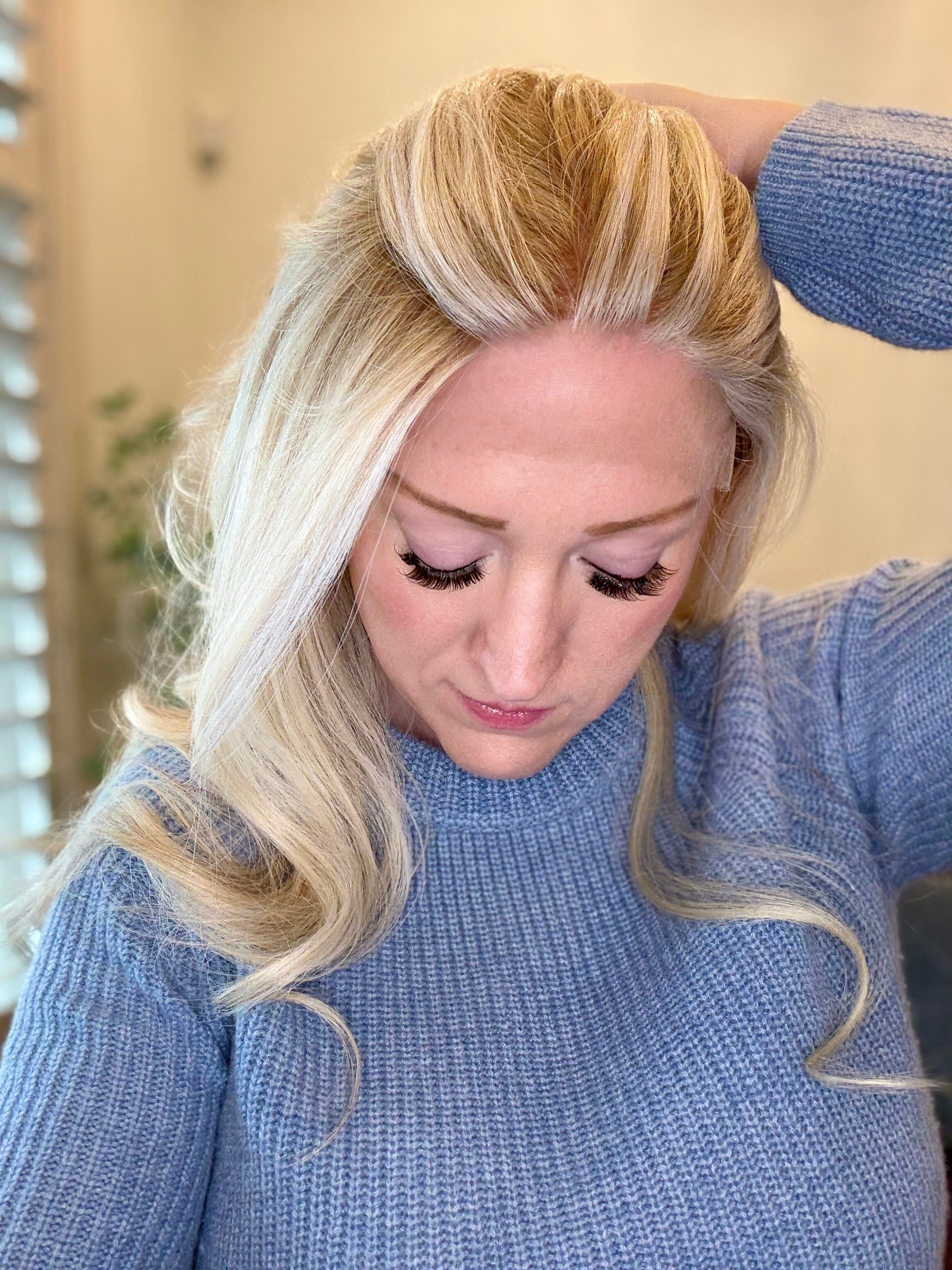 Hair Color: Bright buttery and champagne golden blonde base with beautiful dimension light blonde rooting. .Color shown in indirect sun indoor lighting and warm indoor lighting.